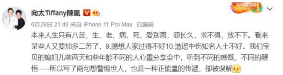 向太不出面解释了,更没有恭喜儿子的品牌建立,儿媳妇郭碧婷更没有说一句话,这一家人的感情路线真的让人摸不透。