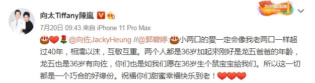 8月7日向佐深夜突然现新动态,形容自己成立了某品牌,用自己小时候的名字刚刚成立。想要让品牌陪着自己未来的宝宝一起成长,然后向佐还表示自己即将当爸,心情也是非常的激动与不安,但感恩这一切。