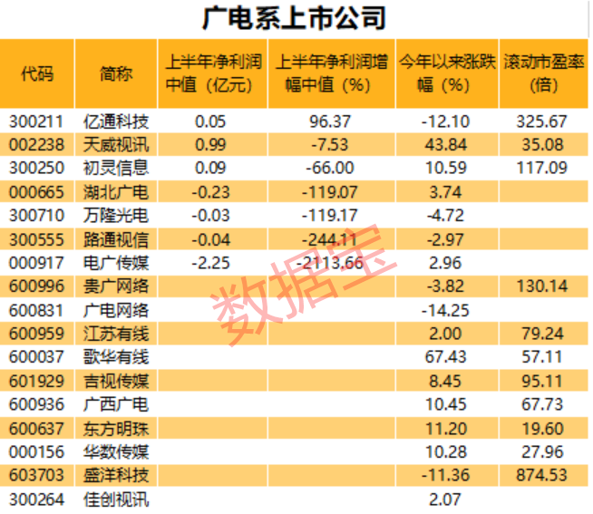 从披露的中报情况来看,虽然广电系个股大多业绩下降,但降幅已开始放缓,少数已转向高增长。比如,天威视讯上半年业绩下降7.53%,相比一季度业绩大跌32.21%,上半年整体降幅回到个位数,显示出公司的业务已经基本回到正轨。