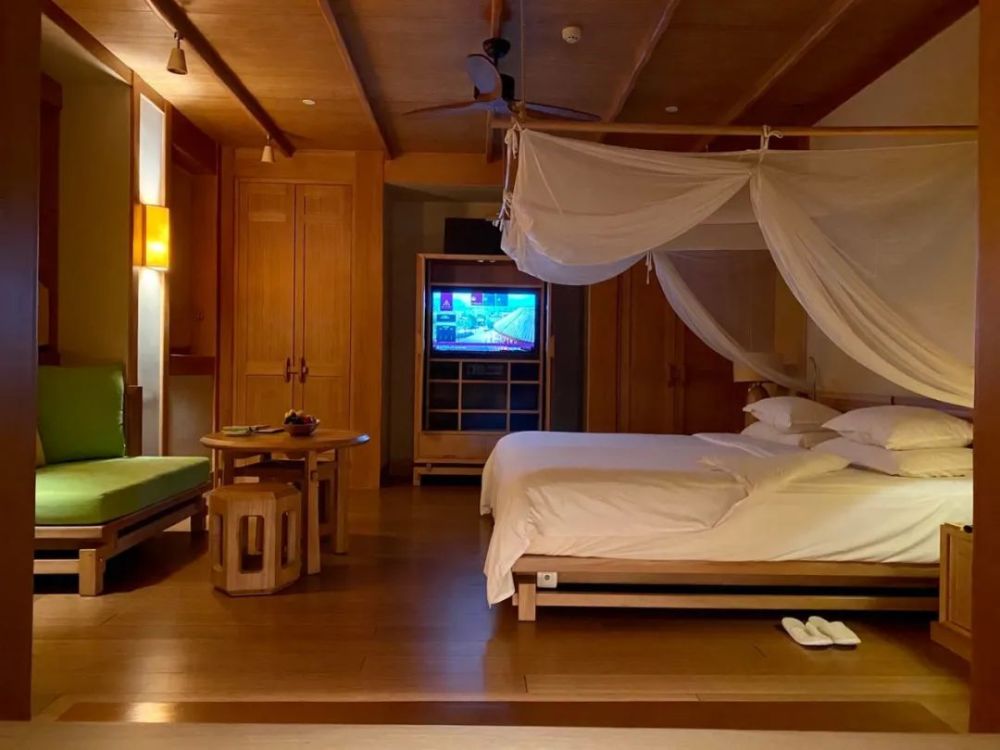 青城山六善也承袭了Sonu对自然的热爱。所以,我一进屋就感觉好像住在了树屋中:房内原生态的木梁墙体,天然的藤编灯具,现代中式原木家具,整个房间似乎看不到墙面,只觉得在自然的木调中睡去。