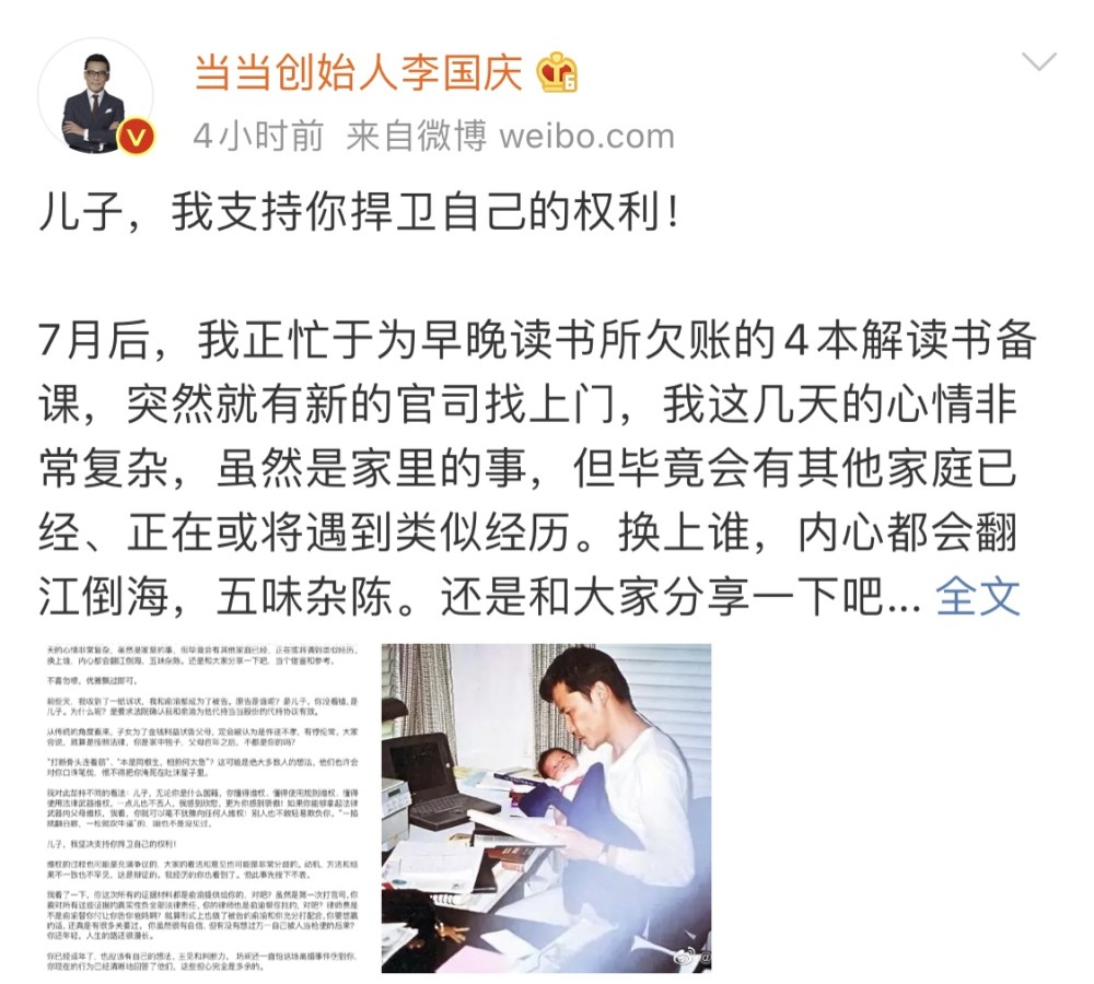 李国庆还喊话儿子,“既然你下了战书,我也自然会在法律规则框架下和你过招。”
