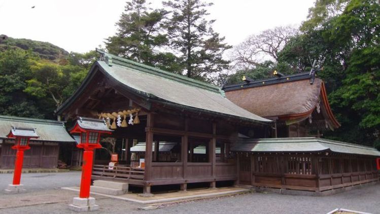 在本殿后方的树林间,还有两座并排的社殿,祭祀了三女神的另两位姊妹,田心姬和湍津姬。