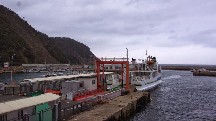 接下来,我们搭上巴士到神凑港,前往更加靠近“神宿之岛”的地方。买了560日圆的船票,上了渡轮。同船的乘客并不多,全是在地的中老年男性,其中好几位扛着钓竿和小冰箱,应该是去海钓的钓客。短程的渡船又小又旧,加上风浪不小,令人头晕想吐。想到甲板上透气一下,结果摇到几乎站不稳。幸好航程颇短,大约15分钟就抵达目的地了。