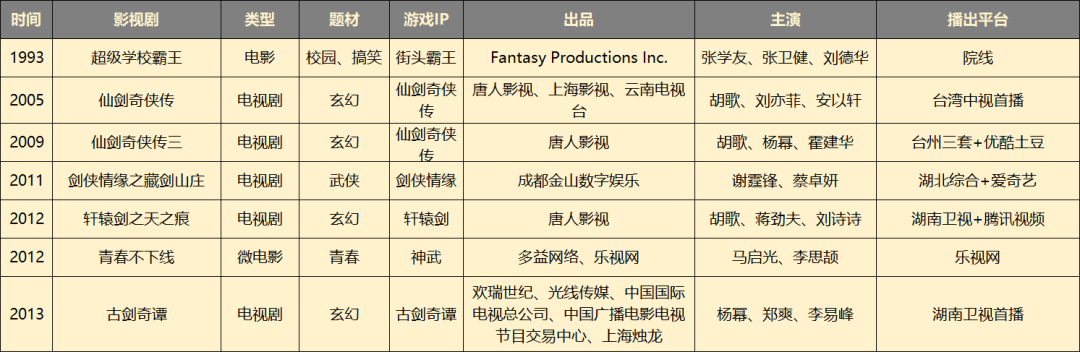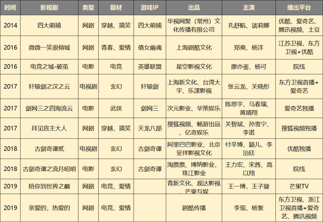 2.早期作品多直接延用游戏世界观背景,多为历史、玄幻题材古装剧,制作门槛高,且难以在网络娱乐、粉丝经济成熟后引起高热度的讨论。