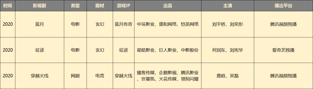 仅2020年上半年,市场上已经出现三部由游戏公司主导,使用内部资源制作、发行的游戏IP影视作品:恺英的《蓝月》、巨人的《征途》以及腾讯的《穿越火线》。