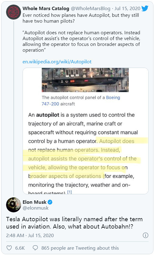 对此,马斯克回复道,“特斯拉自动驾驶(Autopilot)是根据航空业使用的术语来命名的。德国高速公路称作‘Autobahn’,那它是不是也要改名呢?”