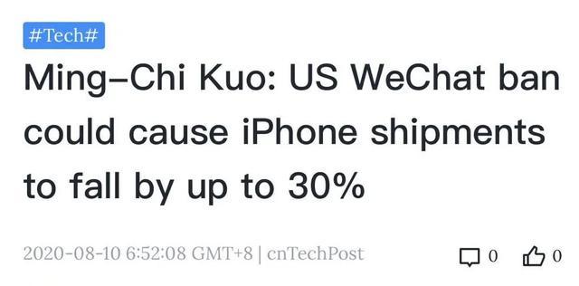 (美国微信禁令或致 iPhone 出货量下降30%)