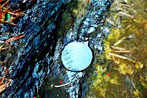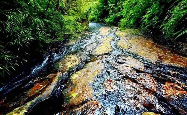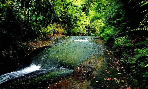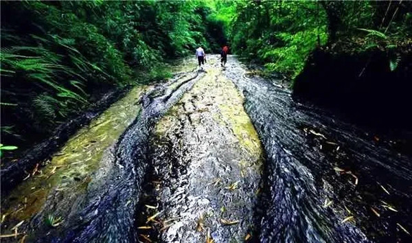 黑色的石滩是经千万年的苔藓造化形成,溪水流淌在石滩上,透明的溪水呈现为石滩的黑色。这里水质清澈,还能捞到小螃蟹。