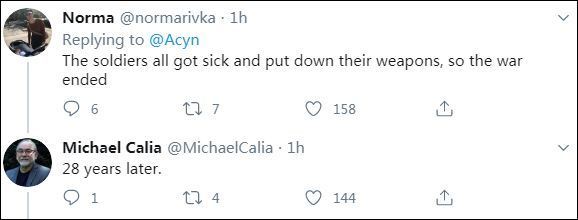 所以按照特朗普的逻辑:大流感发生28年后,所有士兵都生病了,然后放下了武器,二战结束。