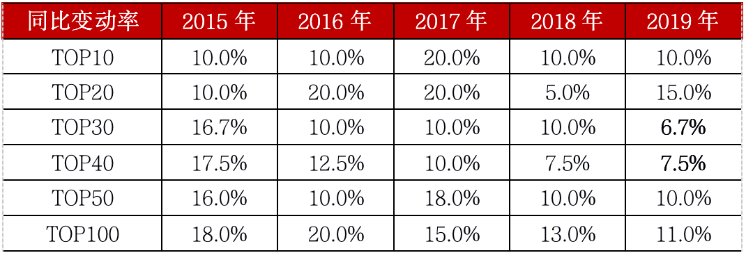 表:2015-2019年TOP100房企分梯度行业排名同比变动率