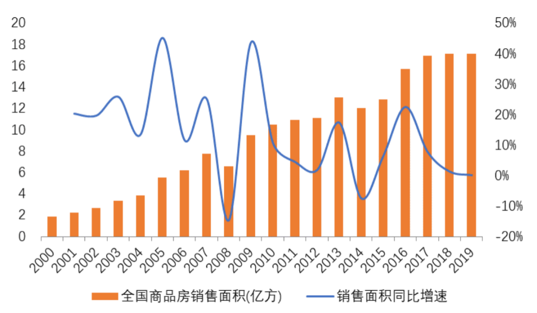 图:2000-2019年全国商品房销售面积及增速