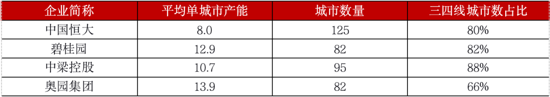 超过80城的房企有4家,分别为恒大、碧桂园、中梁和奥园,这四家房企布局广泛,平均单城市产能不到15亿元。
