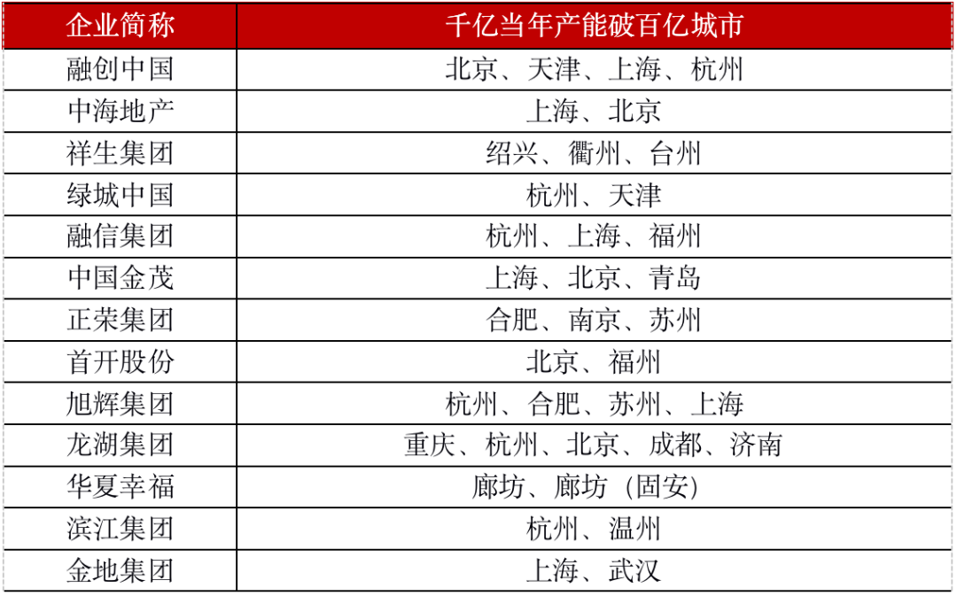 表:深耕型房企千亿当年产能破百亿城市