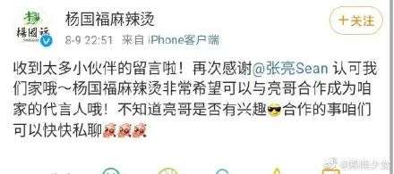 不过这次微博调侃倒是给了杨国福麻辣烫一个绝佳的宣传机会,他们很快注意到了相关舆论并在微博上公开邀请张亮成为他们的代言人。甚至连广告词都不用准备,因为爱凑热闹的广大网友早就帮他们想好了。
