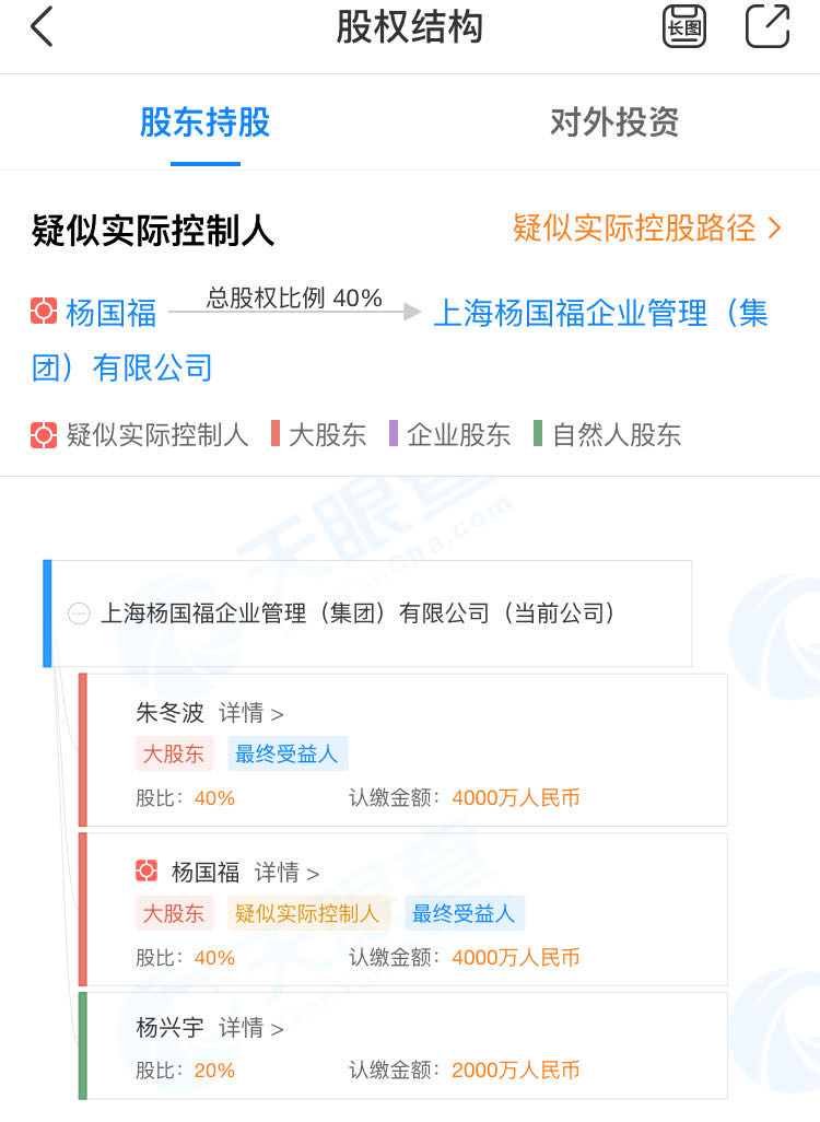 天眼查APP显示,杨国福麻辣烫的母公司上海杨国福企业管理(集团)有限公司法人为杨国福,持股40%,另外两名股东分别是朱东波和杨兴宇。