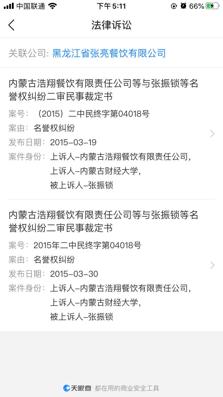 据天眼查APP,张亮曾起诉“张亮麻辣烫”,直到现在这则名誉权纠纷案件都在黑龙江省张亮餐饮有限公司的记录中。2014年内蒙古财经大学食堂某卖麻辣烫的窗口起名叫“张亮麻辣烫”,还贴出张亮与天天的合影宣传。张亮获悉后,将经营该食堂的餐饮公司诉至法院,要求道歉并赔偿180.6万元。