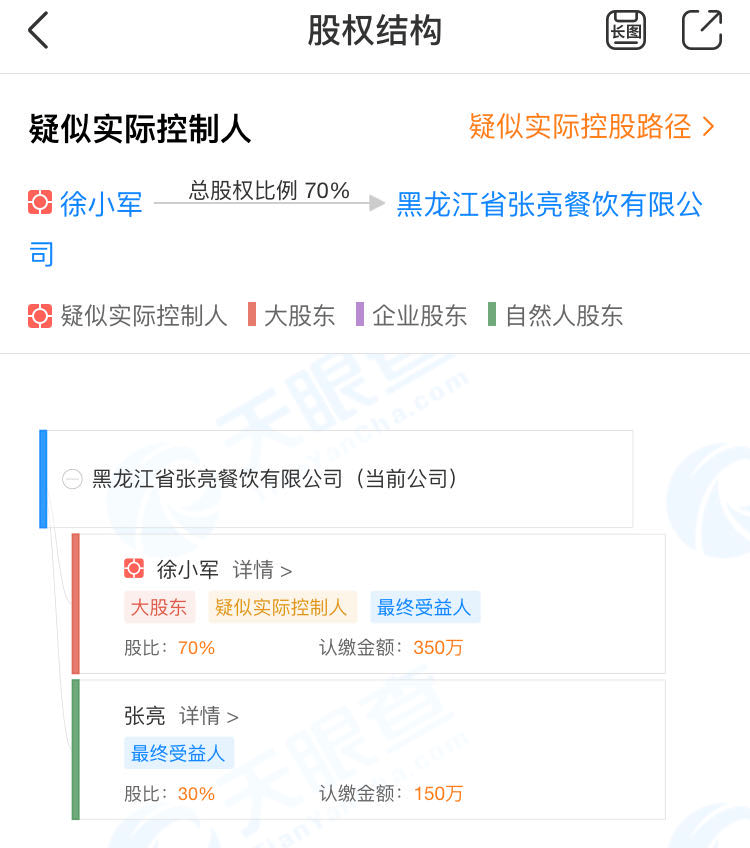 张亮麻辣烫则隶属于黑龙江省张亮餐饮有限公司,法人代表和大股东均为徐小军,持股70%,而创始人张亮仅任监事,持股30%。