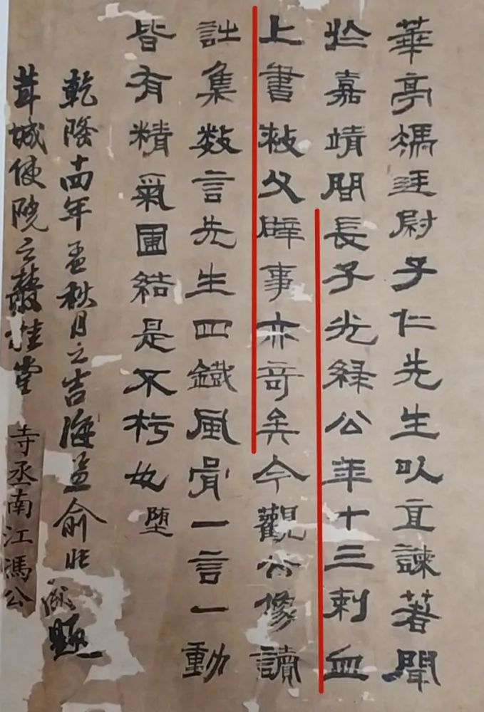 当时,徐恩被判死罪,如非遇到“神迹”,只怕是已经进了鬼门关了。而创造这一“神迹”的,正是他的长子冯行可。冯行可,举人,选应天通判,后人谓之“光禄公”。康熙四十五年进士、海盐人俞兆晟在跋语中叹道:“长子光禄公年十三刺血上书救父辟,事亦奇矣”。
