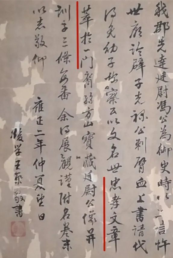 关于画卷是如何保留传承的,王原透露了其中的信息:“裔孙方山宝藏廷尉公像并训示三条”。志书记载,冯恩第六世孙中有一位冯敦忠,“字方山,邑诸生,性好义,遇有关一郡利害事,辄倡为之,著《海塘条文》、《石工利害说》”。据此可知,冯方山急公好义,又擅诗文,且是冯恩裔孙,宝藏《廷尉公像》,得到同郡文士王原、许其祥的亲近,也是情理中事。而档案捐献者冯家桢当是冯方山后裔无疑。