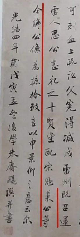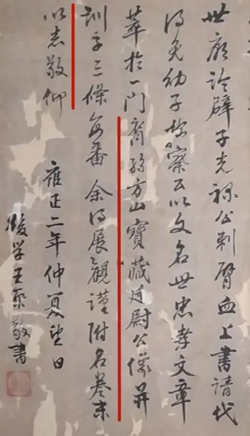 《廷尉公像》和题跋手卷长达2米、高约50厘米,开头部分为冯恩身穿官服的画像,随后有清代名家题跋,从落款上看,五位文士分别是雍正朝的王原(题于雍正二年仲夏。“原”字模糊,似为“原”字)、许其祥(题于雍正十年),乾隆朝的张锡熊(题于乾隆十四年夏日)、俞兆晟(题于乾隆十四年孟秋)和光绪朝的朱赓颺(题于光绪四年孟冬)。