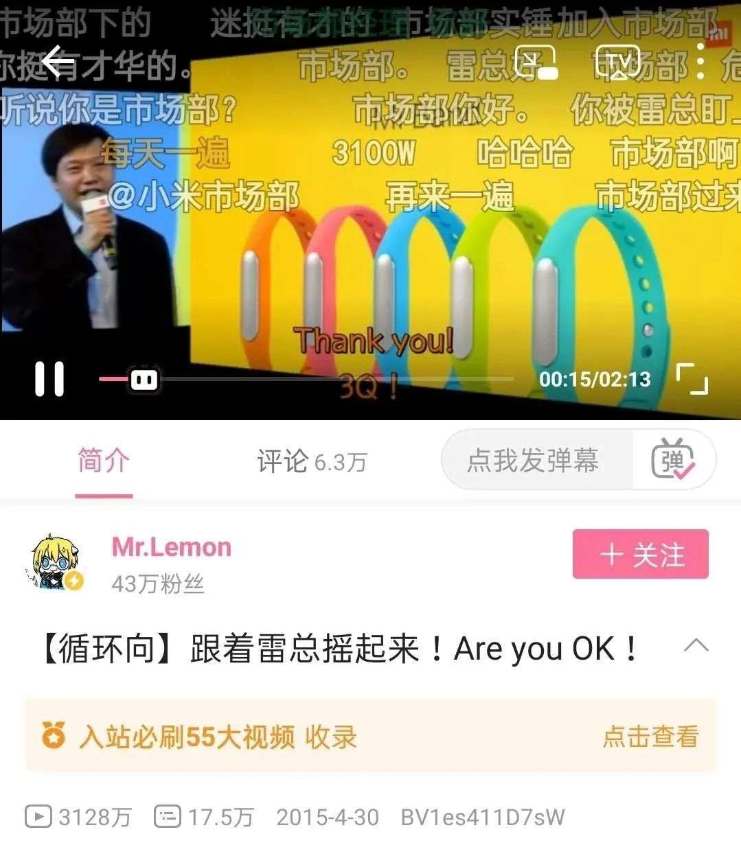 雷军在B站的简介是小米集团创始人、董事长兼CEO,但是他的公告却写着:欢迎大家来看我的演讲会。身份是“歌手”,源于2015年一次发布会的英语发言被UP主Mr.Lemon剪辑成鬼畜视频,视频中“Are you ok”和“Thank you very much”的雷氏发音极具喜感,成为口耳相传的梗。