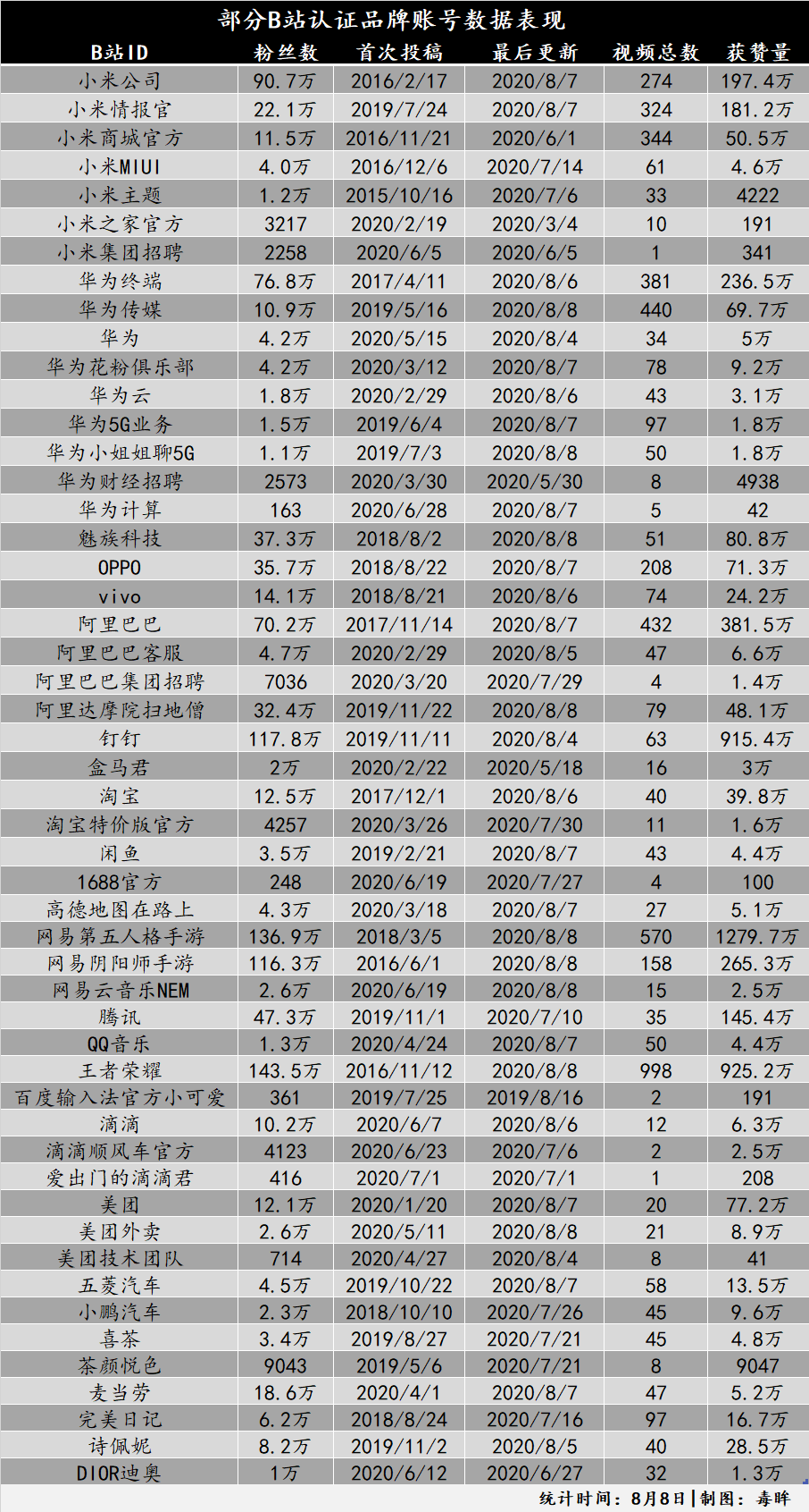 比如小鹏汽车2018年开始在B站开始投稿,今年还在B站办了一场新品发布会;国产美妆品牌完美日记俨然把自己定位成专业美妆博主,通过分享妆教视频收获了6.2万粉丝;奢侈品品牌DIOR今年6月在B站投稿,目前也获得了1万粉丝 、1.3个点赞。