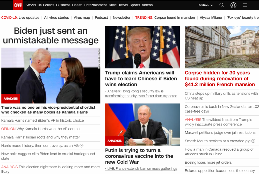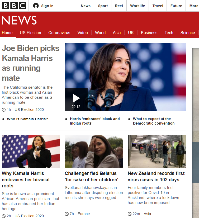 民主党总统候选人拜登选择参议员卡玛拉·哈里斯作为他的竞选伙伴——这是第一位成为副总统候选人的黑人女性和亚裔拉丁裔美国人。而在当天的白宫疫情简报会上,共和党人特朗普总统批哈里斯“对于我而言,是第一选项。大家知道,她初选很糟糕”。