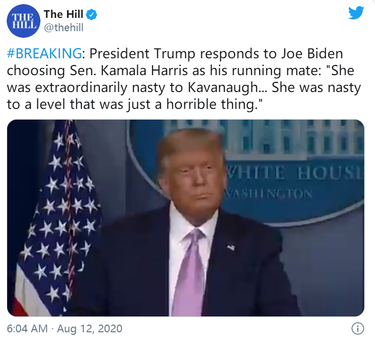 【环球网快讯】已锁定美国民主党总统候选人提名的美前副总统拜登11日提名联邦参议员卡玛拉·哈里斯为其总统竞选搭档。据美媒报道,拜登的竞争对手——现任美国总统特朗普11日对此表示,哈里斯被提名为拜登的总统竞选搭档是他的“头号人选”,并多次用“让人厌恶”(nasty)这个词来形容哈里斯。