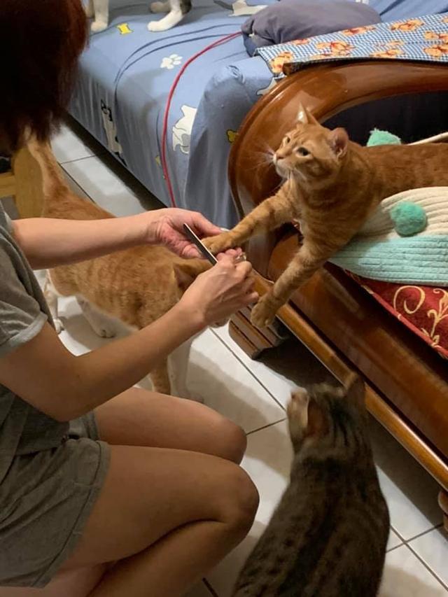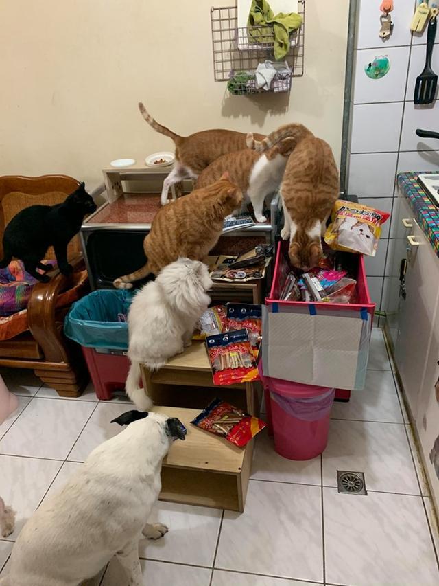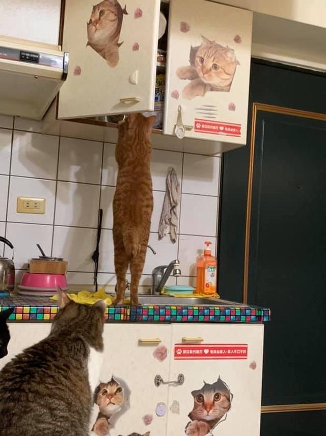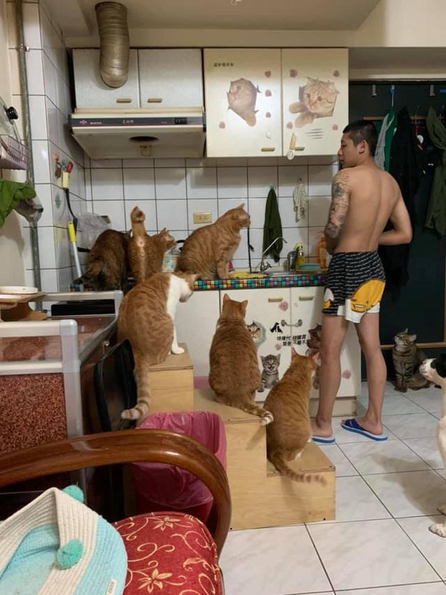 原来,这个刚好是晚饭时间,主人只是刚好要到厨房附近煮点东西吃,然后猫咪们就以为主人要给自己喂零食,所以集体围观等吃。“快上菜、快上菜”