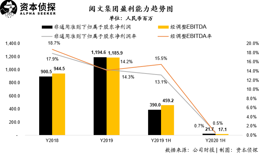 剔除这部分商誉减值影响,阅文集团上半年非通用准则下归属于股东净利润2167.9万元人民币,经调整EBITDA 1711.7万元,相比去年同期均出现大幅度下降,主要是由于公司经营费用提升以及应收账款减值准备提升。