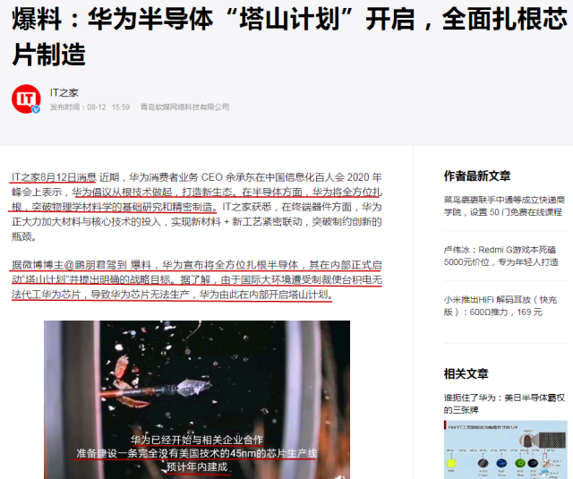 近日,华为“从根出发”,半导体新计划曝光。8月12日,来自IT之家的消息,据微博大V爆料,华为在内部正式启动了半导体新计划“塔山计划”,而且有明确的目标,那就是在今年就将实现45nm技术的生产线,完全不包含美国技术的生产线,不仅如此,华为还和合作伙伴一起,准备在45nm之后建立28nm的完全自主的芯片生产线。