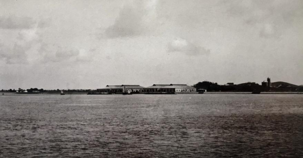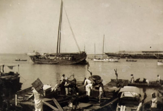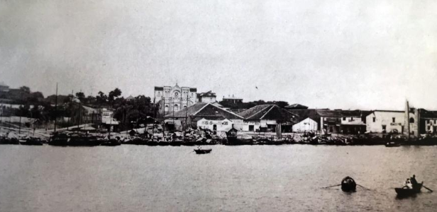 1911年,太古公司转运仓库和轮船。右侧建筑为狮子山上的圣雅阁中学。