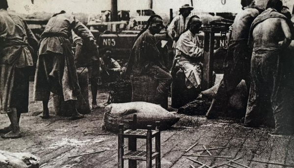1898年,芜湖码头上的搬运工正在搬运行李。