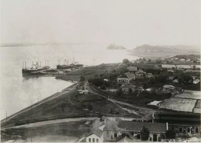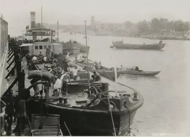 芜湖码头上,正在驳运的船只。远处是1919年7月落成的芜湖海关大楼。芜湖自1876年被辟为通商口岸以后,一直是洋货和皖南米茶丝等物品的集散中心。