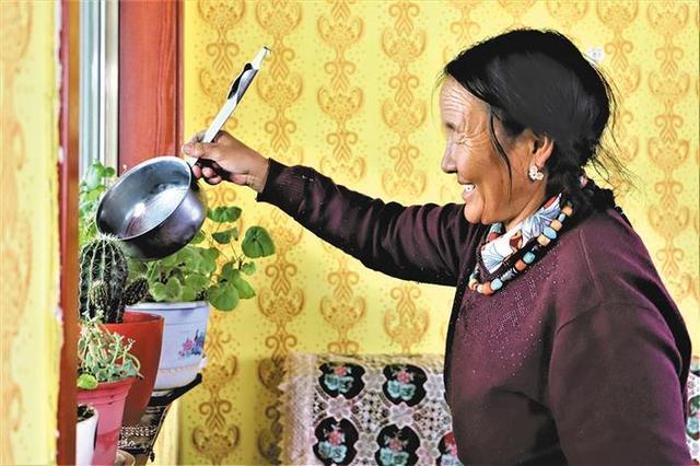 在噶尔县门士乡索多村,藏族阿妈正在家中浇花,脸上洋溢着幸福的笑容。