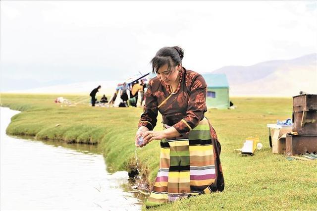 在加木红柳湿地公园,一名藏族女子正在清洗餐具。她和家人要在这里野炊,当地人称野炊为“过林卡”。