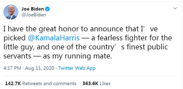 拜登通过推特宣布卡玛拉·哈里斯为自己的竞选搭档