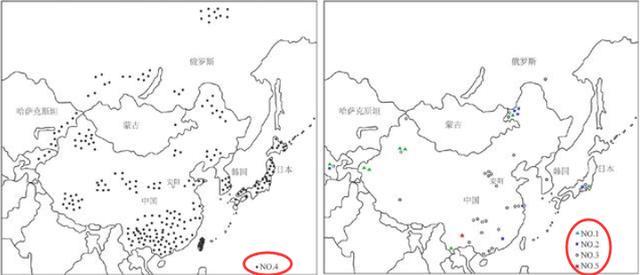 其中,在单倍型类群中的“D”基因(编号为NO.4)非常特别,目前广泛分布在东亚、中亚地区,尤其在日本、韩国、中国南方特别集中,但奇怪的是在中原地区却分布极少。下图源自吉林大学研究报告,D4、Z、N9a、D、D5、B5b对应的编号为NO.1、NO.2、NO.3、NO.4、NO.5、NO.6。
