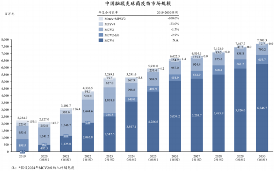 国内脑膜炎球菌疫苗市场预计由2019年22亿元增加至2030年的77亿元,年均复合增长率为12.1%,增长原因主要是由于非免疫规划脑膜炎球菌单价较高,相对多糖疫苗适用人群更广,总体销售额较大。
