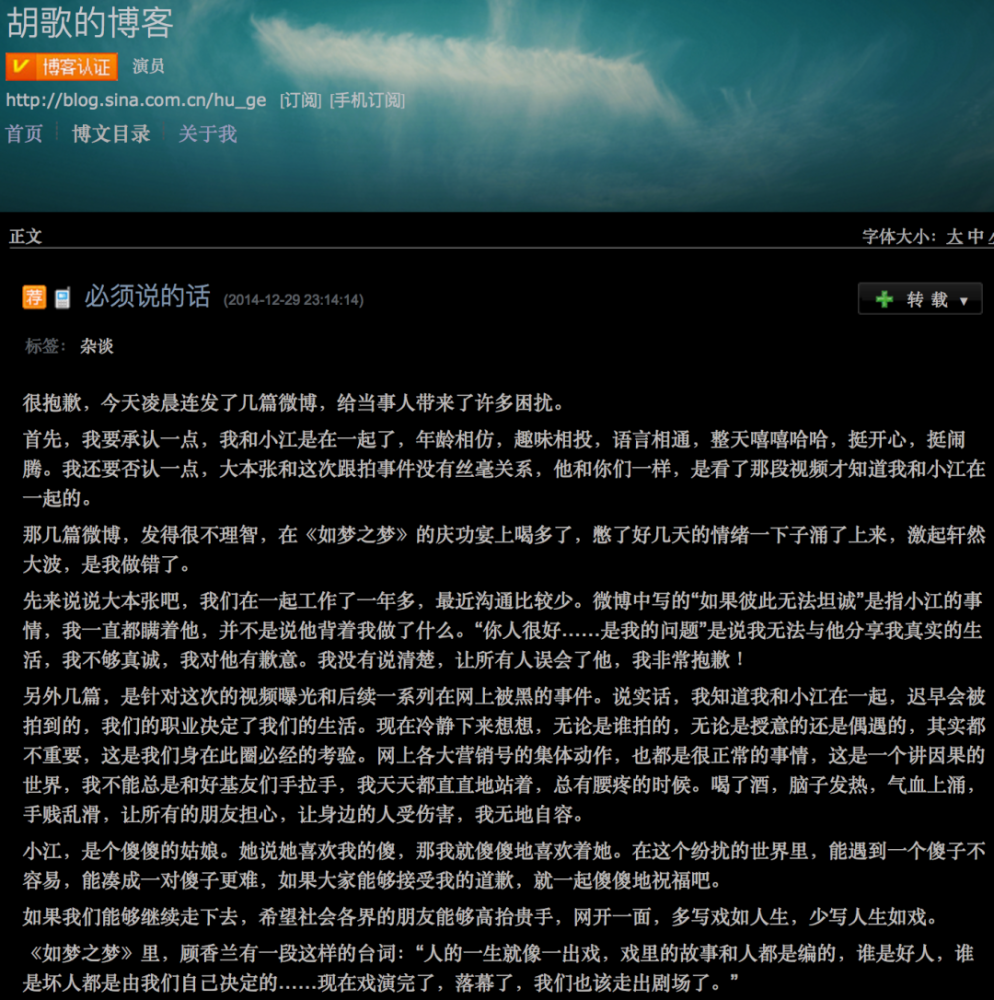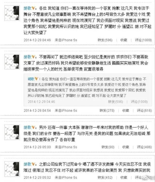 2014年12月24日,两人的恋情被媒体曝光,引起轩然大波。那段时间,胡歌正在巡演话剧《如梦之梦》。事件爆发后,作为一个国民偶像,他几乎可以想象她的境地。在5天后的话剧庆功宴上,一杯杯苦酒入喉,他甚至想到了就此结束。凌晨4点,他借着酒意,连发4条微博,其中一条写道:梦醒时分,相忘“江胡”。后来,胡歌删掉了这几天的微博,但是,互联网留下了它们。但梦醒时分,他还是做不到放手。