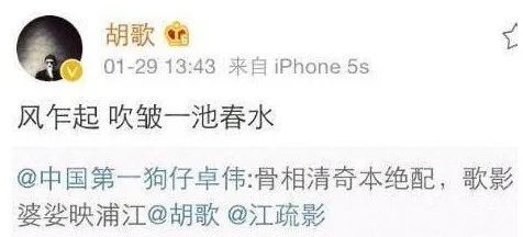 2015年1月29日,在“中国著名狗仔”卓伟开通微博的第一天,第一次@的明星就是胡歌和江疏影,并写道:“骨相清奇本绝配,歌影婆娑映浦江。”矛头再一次对准二人。仅仅35分钟后,胡歌转发回怼:风乍起,吹皱一池春水。(该词后一句为“干卿何事”)这条微博既是回复卓伟,又像是说给来往看客。此后,任红尘熙熙攘攘,二人终是只字不提。直到2015年7月,江疏影宣布单身,这段情,何起?何终?是只属于两个人的怀恋。