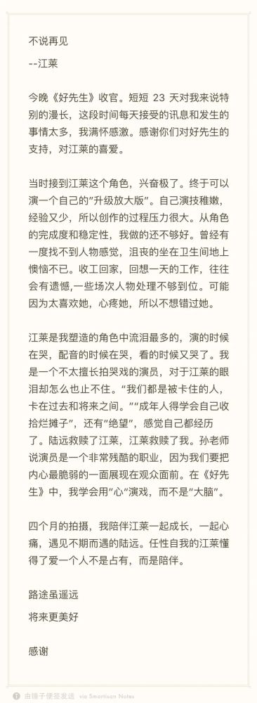 那一年,在电视剧《好先生》的发布会上,江疏影公开承认单身,从此不愿多谈。只是在一年之后的《好先生》收官日时给“江莱”(江疏影在剧中饰演的角色)写了一封信。