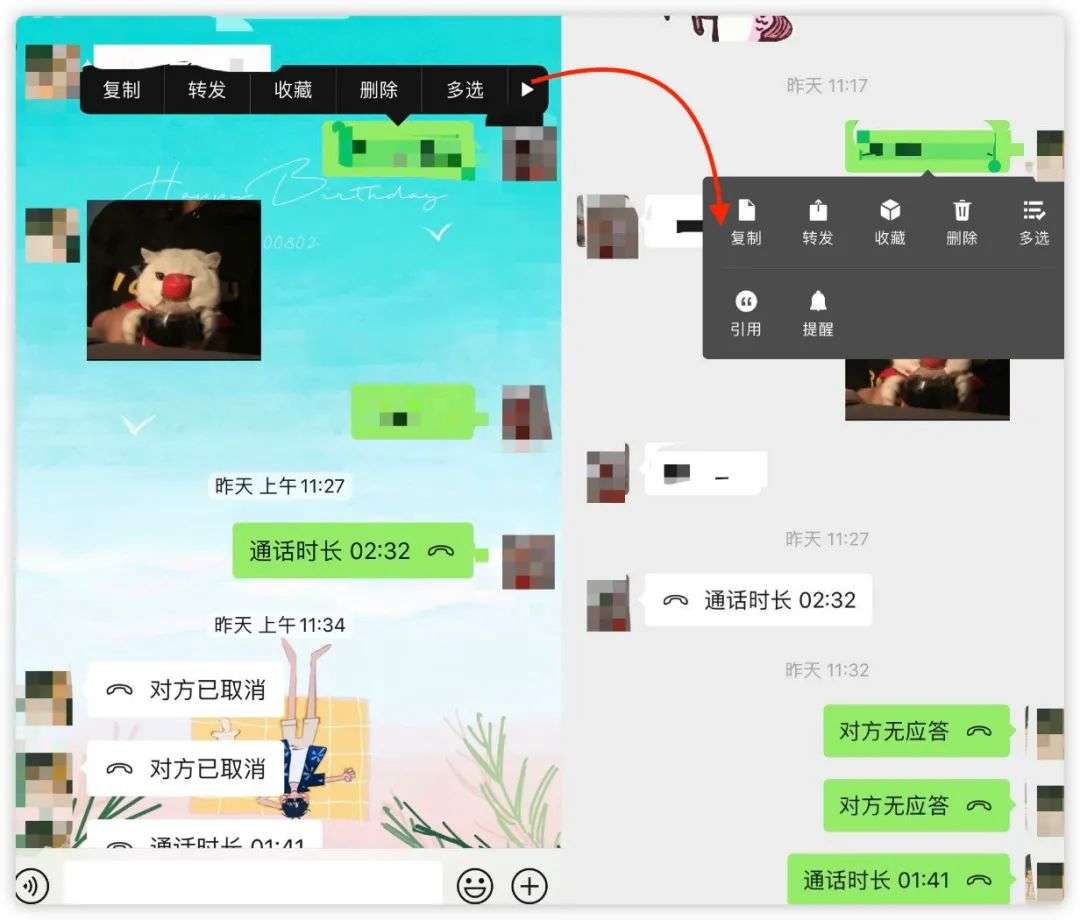 不仅聊天页面操作对用户更加友好,聊天对话框的功能按钮样式也被优化,由原先的单行功能按钮转变为并列的两行选项,再也不需要点击三角符号跳转到“引用”和“提醒”两个功能,更加清晰有序、一目了然。