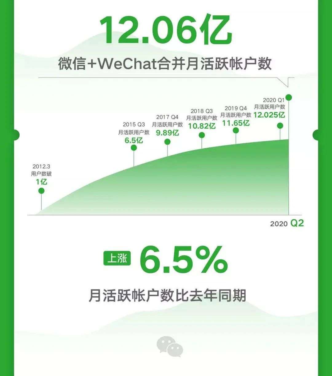 今天下午,腾讯公布了2020年第二季度财报,根据财报显示,微信及WeChat合并月活跃账户数已经达到12.06亿,比去年同期增加6.5%。