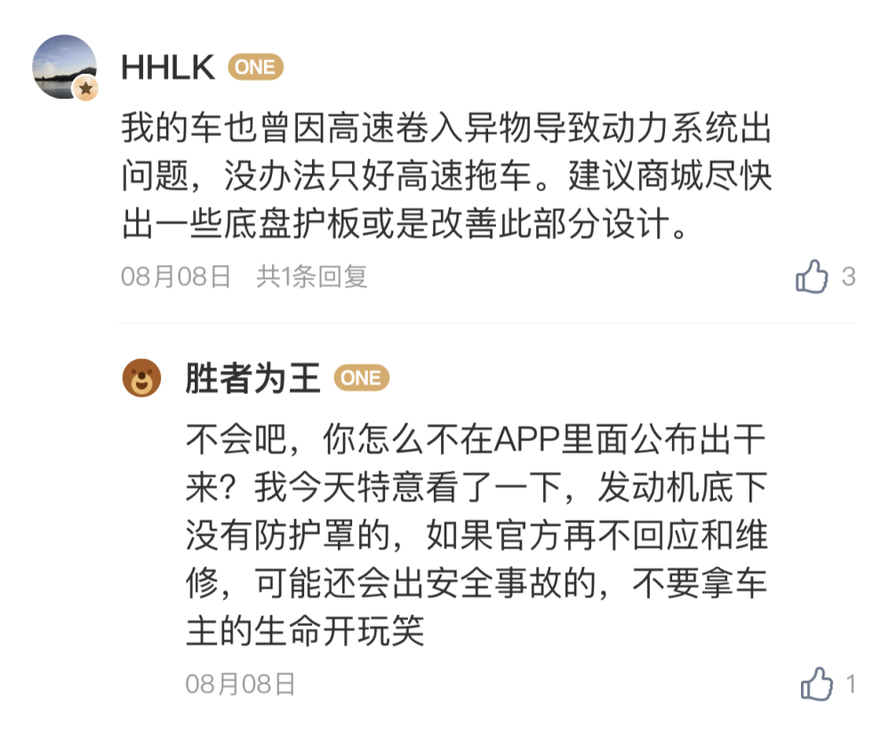 事实上,理想ONE因为没有底盘护板而被卷入异物已经不是第一次。有理想ONE车主在理想汽车App的社区里透露,他的车辆也曾因为在高速行驶中卷入异物,导致动力系统出现问题,最终采取拖车的方式驶出高速。