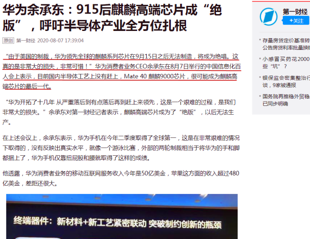 中芯国际也在第二季度财报会上表示,针对9月14日后是否继续给华为代工的问题,中芯国际将按照国际规定实施,这也意味着如果中芯国际没有获得美国商务部的许可证,也无法给华为芯片代工。近日,华为确认麒麟停产,8月7日,在信息化百人会上,余承东亲自宣布,9月15日之后,麒麟系列芯片将无法制造,这也意味着华为麒麟芯片确认将停产。