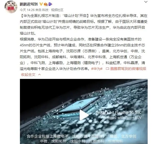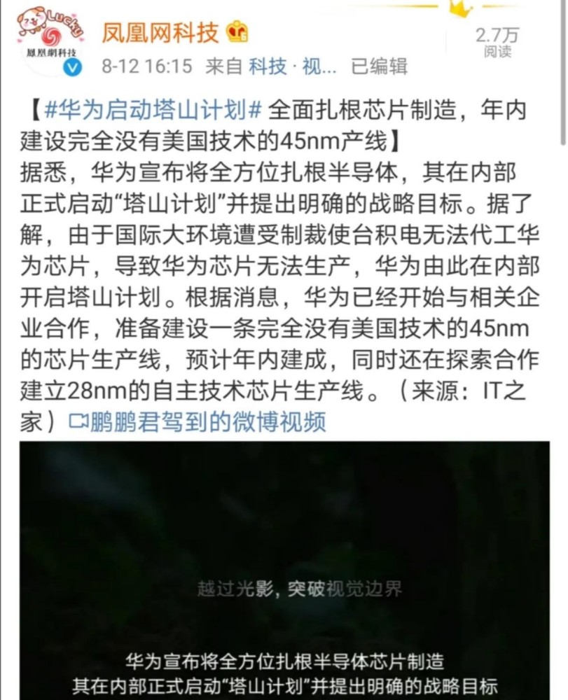 微博大V“鹏鹏君驾到”在下午发了这样一条微博,大致意思是:华为在内部正式启动了一个名为“塔山计划”的半导体产业链项目,准备建设一条完全没有美国技术的45nm生产线,自己造芯片,以应对“台积电无法为华为代工”的事实。