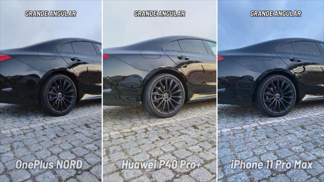 而在一加Nord、华为P40Pro+和iPhone11ProMax的拍照对比中,可以看到华为P40Pro+拍摄的照片曝光度最高,同时在照片中的汽车车身和地面由于曝光度较高,所以拍摄出来的颜色则是呈现灰色的。一加Nord和iPhone11ProMax拍摄的照片曝光度较低一些,其中iPhone11ProMax的曝光度最低,华为P40Pro+拍摄的天空颜色发灰,iPhone11ProMax拍摄的天空颜色发蓝,而一加Nord则介于两者之间。