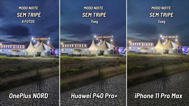 在这组夜景拍照的对比中,可以看到一加Nord、华为P40Pro+、iPhone11ProMax之间拍摄的照片,区别上还是比较明显的。iPhone11ProMax拍摄的照片曝光度控制的一般,主要是表现在建筑物顶部的圆形的灯具的光晕较大,光线的发散没有能够很好的控制住。华为P40Pro+在灯具的曝光度方面的额控制应该说做的最好,其次是一加Nord对曝光度的控制。