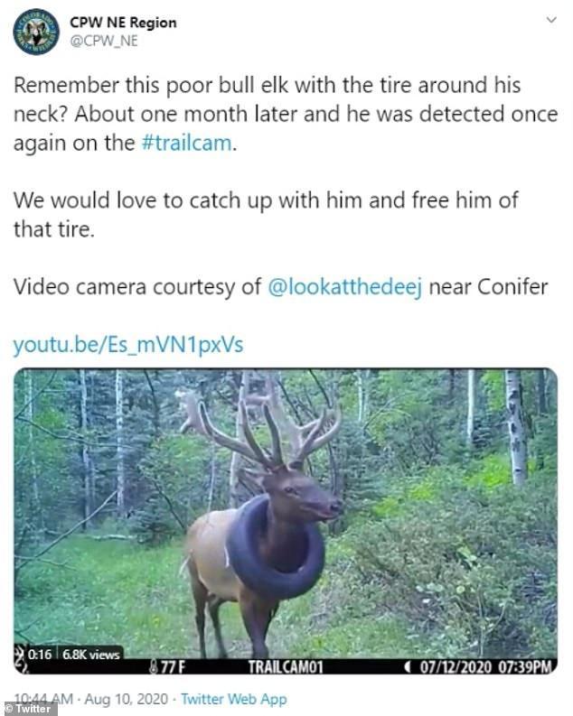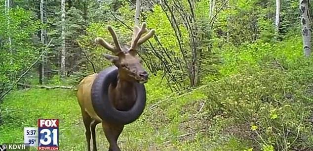 CPW的发言人杰森·克雷(Jason Clay)对Fox 31台的记者称,专家认为虽然这只麋鹿仍然非常年轻,但脖子上卡住的轮胎可能很快会让它呼吸困难。